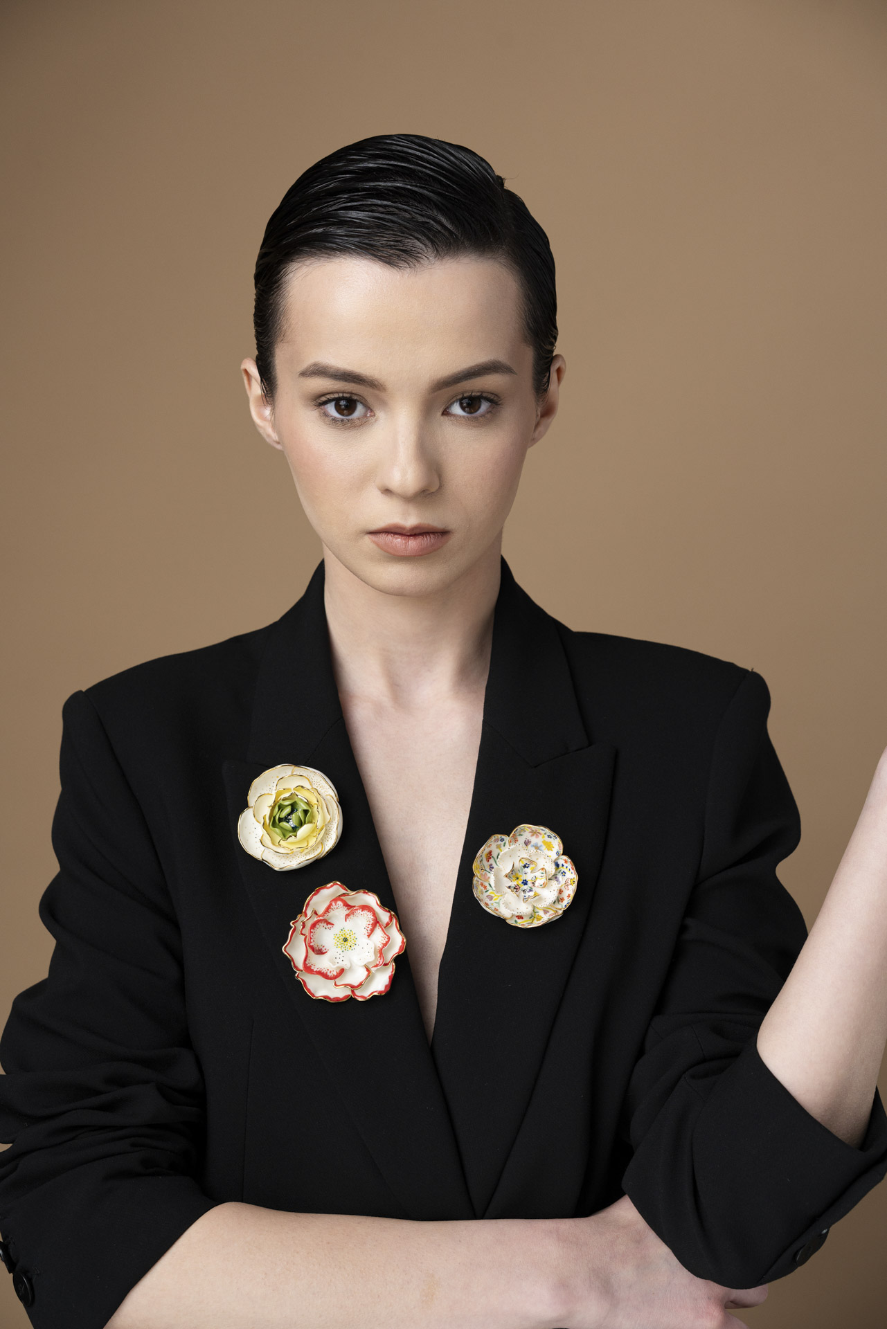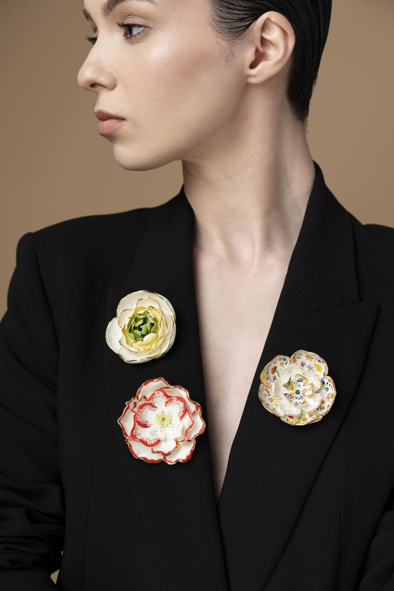 Spilla floreale in porcellana dipinta a mano, un pezzo unico realizzato nel nostro atelier. Modellata con cura e arricchita da dettagli in oro 24 carati, questa spilla elegante racchiude la delicatezza della natura in un accessorio senza tempo, perfetto per look femminili e raffinati.